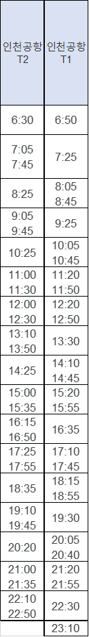 인천공항 2터미널 출발기준 AM 6시 30분 첫차, PM 10시 50분 막차입니다. (인천공항 → 서울대)