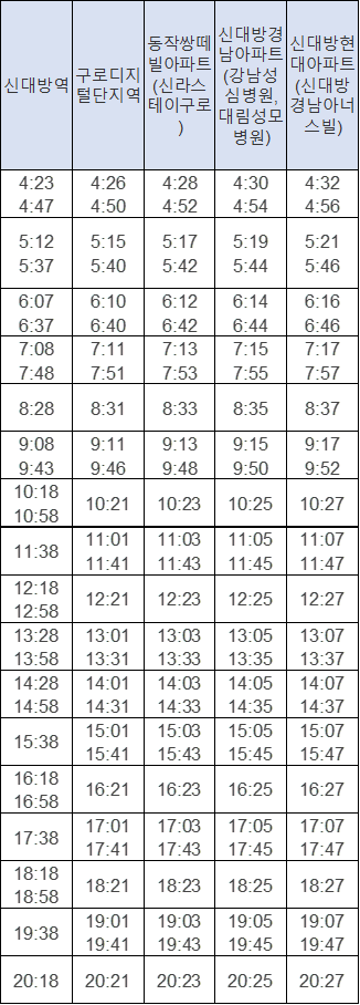 | 동작쌍떼빌아파트 (신라스테이구로) | → | 신대방 경남아파트 (강남성심병원) | → | 신대방 현대아파트 (신대방 경남 아너스빌) | → | 보라매공원 |